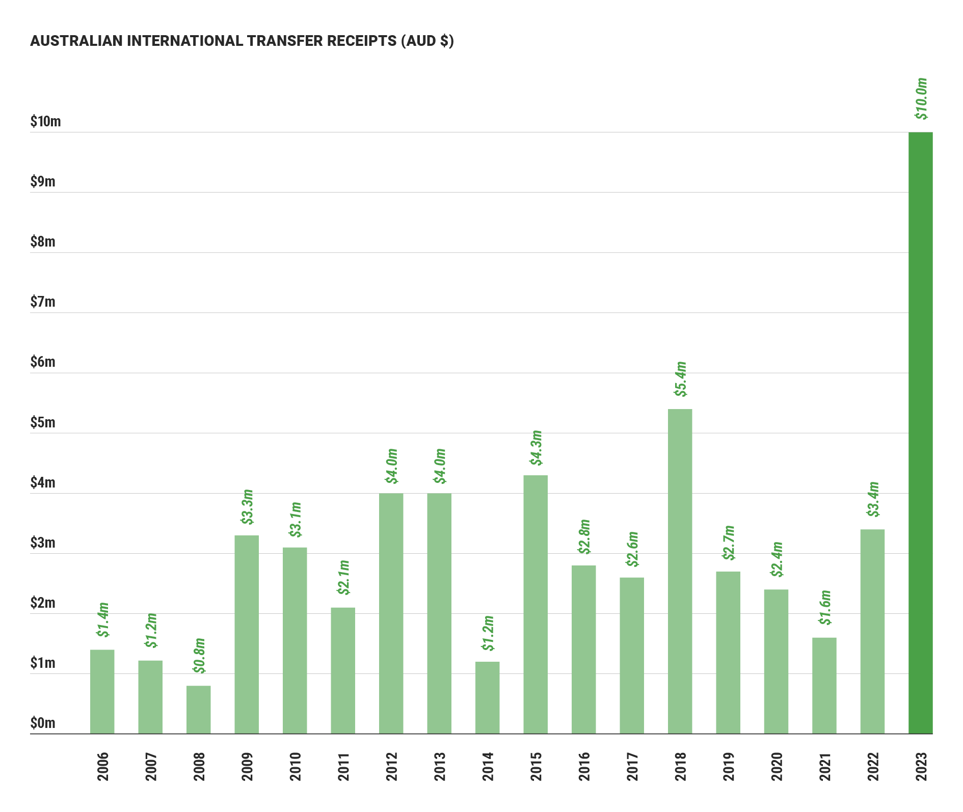 This collective take is nearly double the previous high, $5.4m in 2017-18, and nearly triple the $3.4m received in 2021-22.