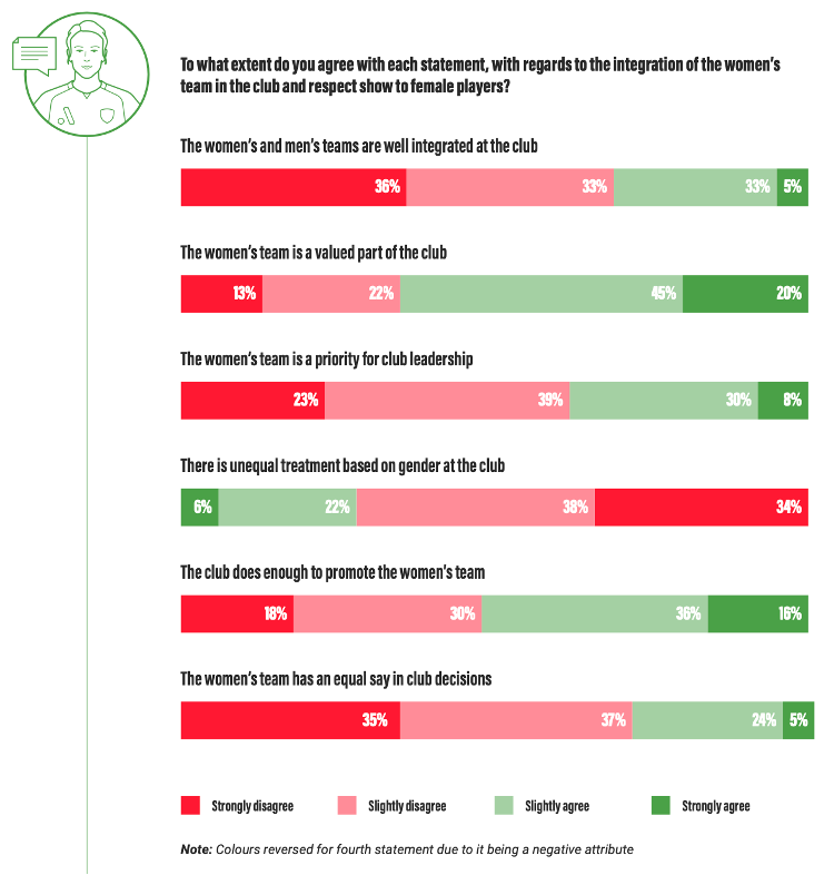 The Report reveals the results of this part of the survey, aggregated across the entire playing cohort. It shows that less than a third (31%) of players agreed that the women’s and men’s teams were well integrated at their club.