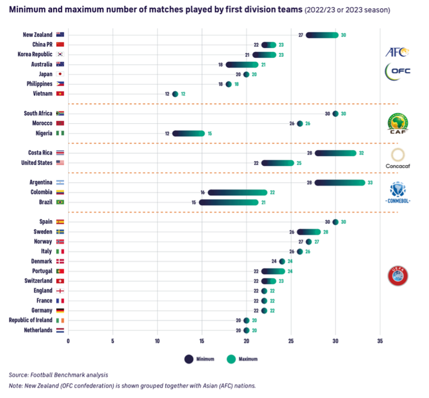 Also in the Women’s World Cup section, the Report borrows analysis from FIFPRO to identify that ALW risks falling short in the number of match minutes it provides. Looking at the domestic leagues of World Cup nations, only four of the 27 FIFPRO assessed guaranteed fewer matches to its players last season.