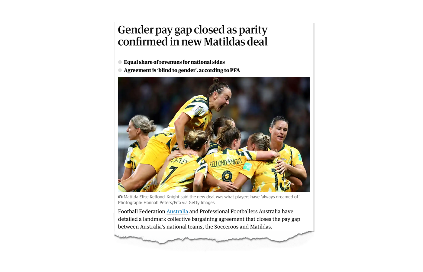 The landmark 2019-2023 National Teams Collective Bargaining Agreement (CBA) achieved gender equality between the Matildas and the Socceroos.
